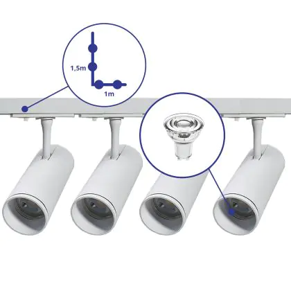 | Fabrikantnaam | Complete L shaped 1-Phase Track Set White incl. 4x Spot fixture + GU10 2700K 3W Dim - 1 x 1.5 meters | |